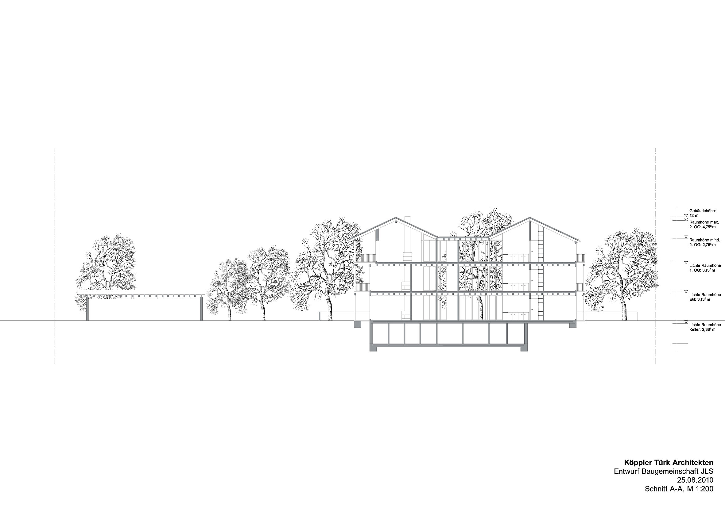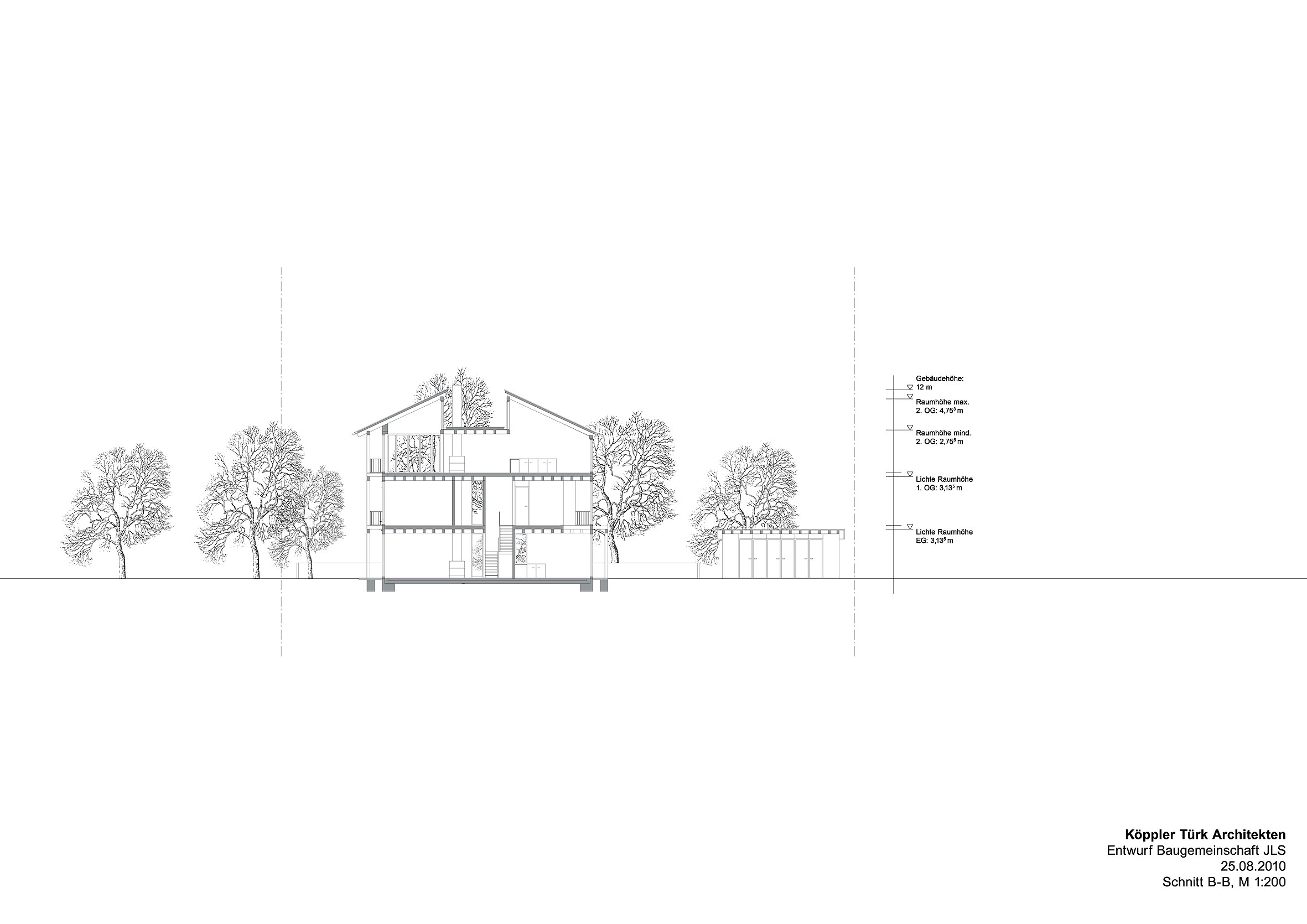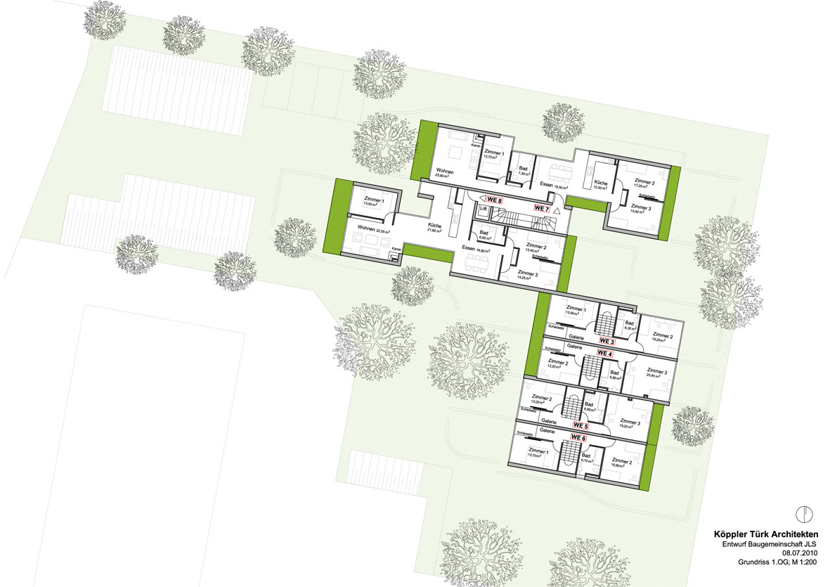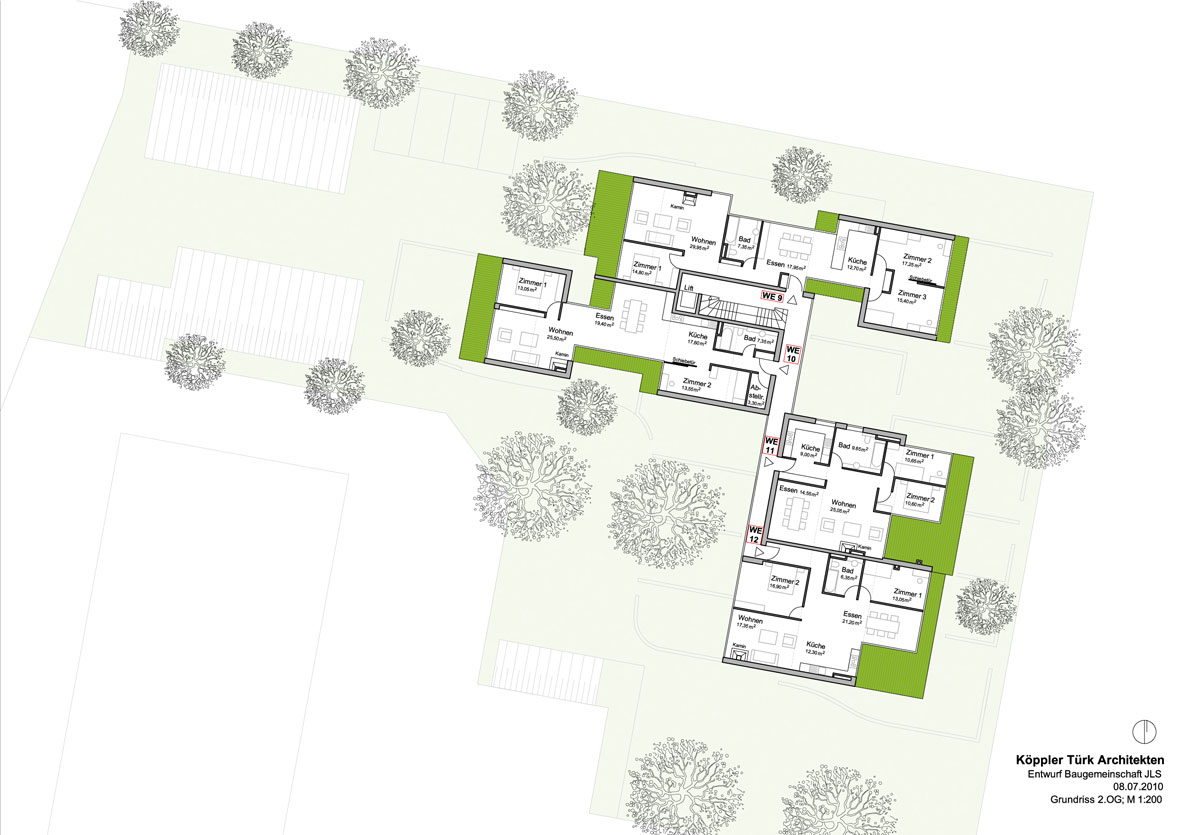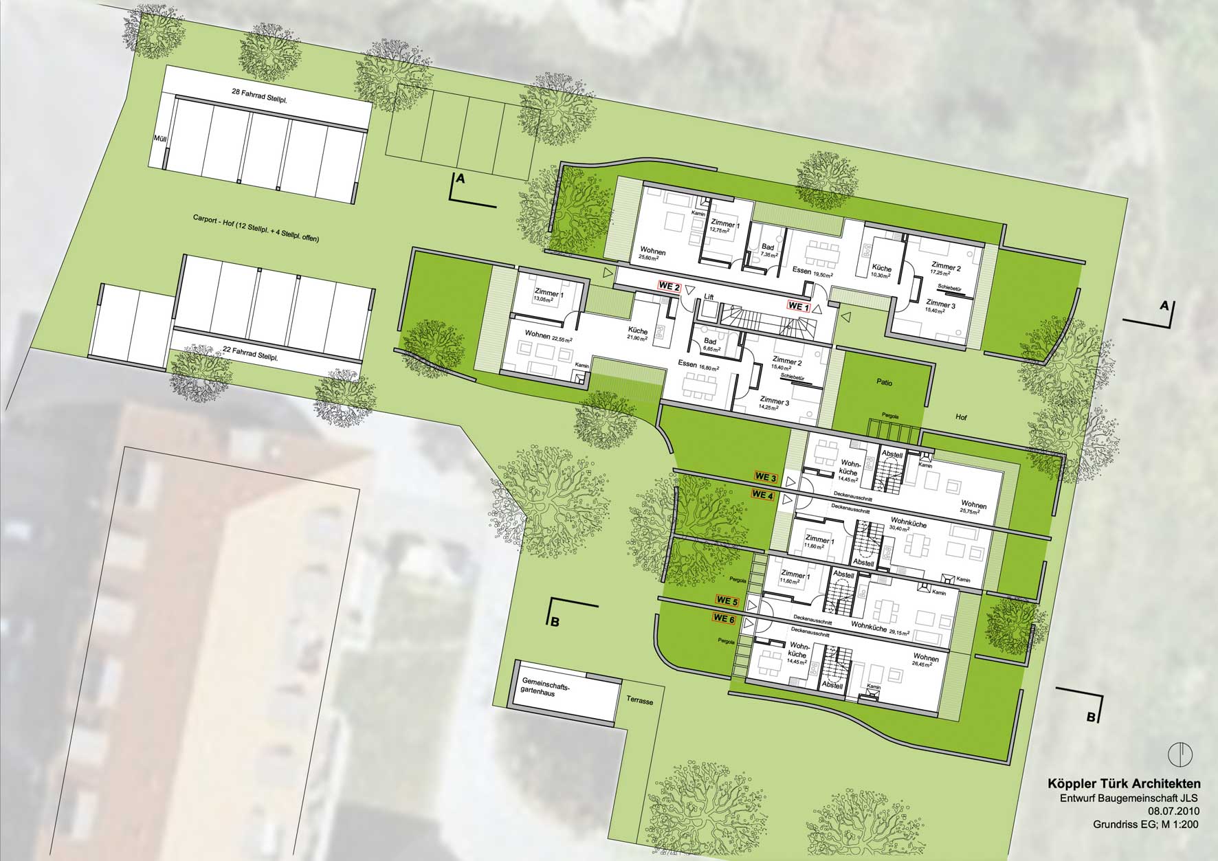 Baugemeinschaft "Das Gartenhaus" >Download der Grundrisse im Maßstab 1:200 hier Geplant sind zwei Gartenwohnungen im Erdgeschoss mit jeweils ca. 150 m², denen beiden ein privater Garten mit Terrasse von über 100 m² zugeordnet ist. Darüber liegen zwei ca. 150 m² große Etagenwohnungen mit großzügigen Balkonen sowie zwei Dachgeschosswohnungen mit ca. 131 m² sowie mit ca. 108 m², die beide über einen offenen Dachstuhl verfügen. Der südliche Teil des Gebäudes besteht aus vier Garten-Maisonettwohnungen, die westlich versetzt den architektonischen Abschluss des Ensembles bilden. Hier lassen sich auf zwei Ebenen Wohnräume zwischen ca. 108 m² und 118 m² gestalten. Die darüberliegenden Dachgeschosswohnungen bieten Platz für ca. 98 m² sowie 113 m² Wohnfläche, ebenfalls unter einem offenen Dachstuhl. Alle 12 Wohnungen verfügen über sehr gute Lichtverhältnisse. Die Grundrisskonzeption der Wohnungen folgt dem Prinzip der Verbindung der Innenräume der Wohungen mit den sie umgebenden Garten- und Naturräumen über die Raumelemente der Terrassen, des Patios, Loggien und Dachterrassen. Der naturumschließende Charakter wird so zur bestimmenden Atmosphäre der Wohnungen: Das durch die umgebenden Bäume einfallende Licht, Blätterschatten auf dem Holzboden, das Rauschen der Baumkronen, das Ziehen der Wolken über den in der Sommerwärme liegenden Holzterrassen – usf. In diesem Sinne der Naturnähe des Wohnens in dem Gebäude sind optional Kamine in den einzelnen Wohnungen vorgesehen (s. jew. Grundrisse). Im Winter wie im Sommer bildet so auch innerhalb das Naturelement des Feuers einen atmosphärischen Kern innerhalb der Wohnungen. Die Begrenzung der Privatgärten der Erdgeschosswohnungen durch Gartenmauern, die im vorderen Teil des Gartens in Hecken übergehen, bilden eine gewollte Trennung zwischen den persönlichen und gemeinschaftlichen Bereichen. Die grünen Freiräume auf dem Grundstück bieten neben Erholung und Entspannung auch Möglichkeiten zur Begegnung und zum Austausch zwischen den Bewohner/ innen. Das Gemeinschaftshaus mit einer geplanten Größe von ~ 50 m² bietet Raum für private Feiern, Eigentümerversammlungen oder einfach zum gemeinsamen Treffen – der Fantasie sind hier keine Grenzen gesetzt. Letztlich entscheidet über die Nutzung der Gemeinschaftsflächen die zukünftige Hausgemeinschaft. Im westlichen Teil des Grundstücks sind 14 PKW Stellplätze vorgesehen, die zum Teil überdacht als Carport oder auch unter freiem Himmel für Besucher geplant sind. Die Kosten betragen ca. 4.500.- € für einen zusätzlichen Carport. Haushalte, die bewusst auf den Pkw verzichten, werden daher auch nicht indirekt an den Kosten mitbeteiligt. |