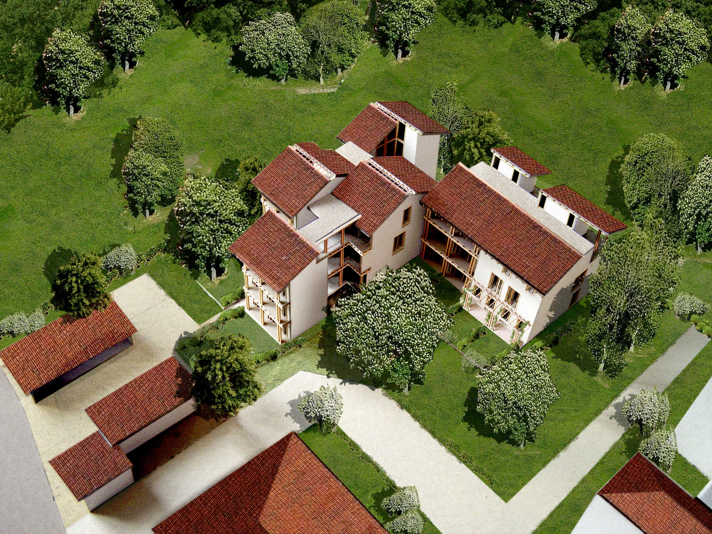 ![]() Gesamtansicht der Anlage von Südwesten aus gesehen Grundriss Erdgeschoss, genordet![]() Grundriss 1. Obergeschoss ![]() Grundriss 2. Obergeschoss ![]() Schnitt Nordflügel (A-A) ![]() Schnitt Südflügel (B-B) |