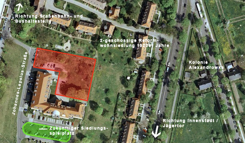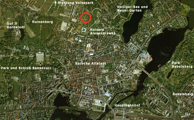 Das Grundstück liegt nördlich der Potsdamer Innenstadt in der Jägervorstadt. Über die Jäger- und Pappelallee ist die ruhige Anliegerstraße am Grundstück gut zu erreichen. In nur wenigen Gehminuten über den ´Schragen´ erreicht man die denkmalgeschützte Russische Kolonie Alexandrowka.